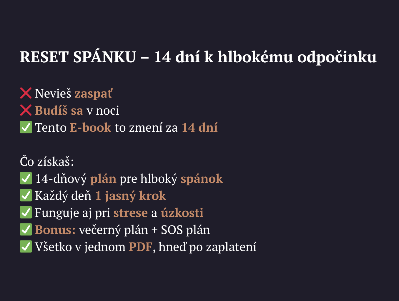 Zaspávaj rýchlo. Spánok ako keď ťa vypnú. Praktický e-book, ktorý ťa za 14 dní reštartuje.